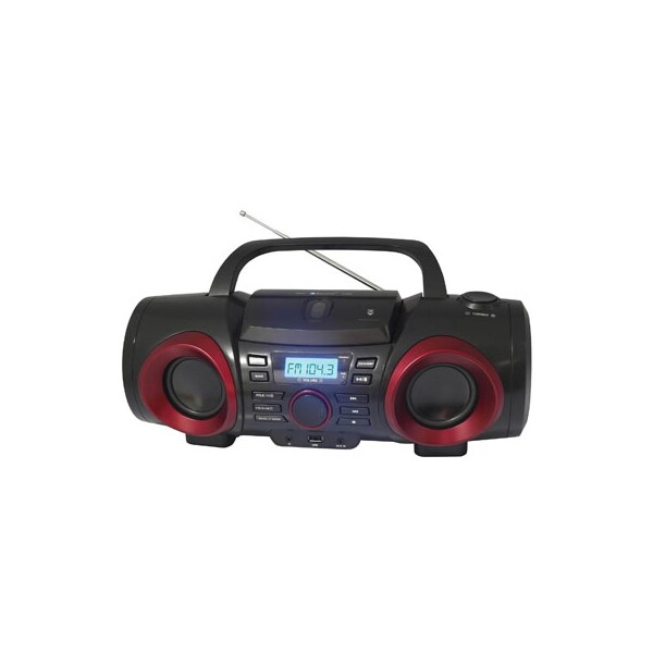 MP3/CD Boombox with Bluetooth.Bring music with you everywhere you go with the Naxa's MP3/CD Classic Boombox with Bluetooth (NPB267). It comes with an aux input for use with MP3 players and other nonwireless devices. This portable boombox includes an AC power cable for longterm performance. It features a builtin AM/FM radio for listening to stations and will also play CDR and RW discs. It comes in an attractive black and red color scheme and features simple controls for changing between all the features. Use this portable device out by the pool, camping, or at outdoor parties and enjoy tunes wherever you go. Stream music wirelessly from smartphones, tablets, and other Bluetooth enabled devices Plays CD, CDR/RW, and MP3 discs. Builtin MP3 playback from a USB flash drive.AM/FM radio. 3.5mm AUX input connector for music players without Bluetooth.3.5mm headphone out jack Power: AC 110220V adapter, 6 x C batteries (not included) Accessories included: AC power cable.