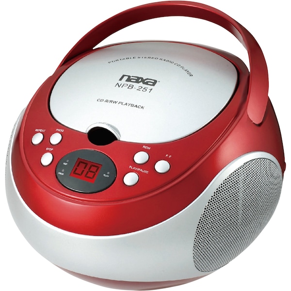 The NPB251RD Portable CD Player and AM/FM Stereo in red from Naxa is a top-loading MP3/CD player with AM/FM stereo radio, aux input, 16/19 track programmable memory, program, skip, pause and repeat functions, LED digital display and soft-eject CD cover. The telescopic antenna ensures you'll receive all your favorite radio stations, and its miniature boom box design offers super convenient portability, no matter where you choose to take your tunes!