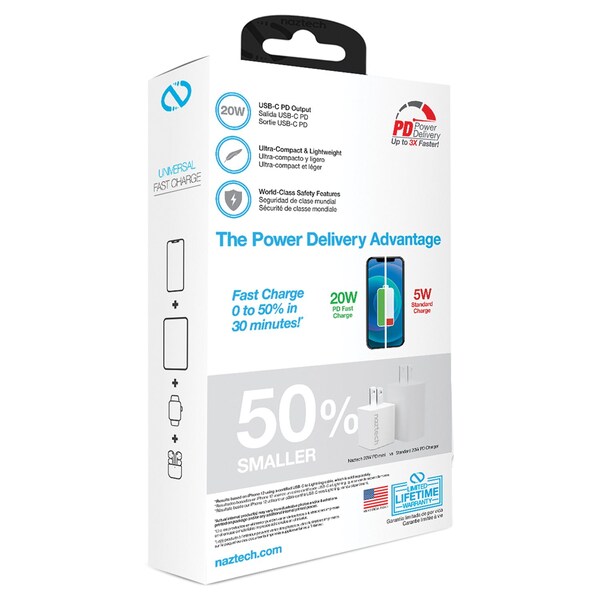 Need power fast? Get Naztech's 20-Watt Power Delivery Mini Fast Wall Charger in White. Don’t be fooled by this charger’s small size. It packs an incredible punch. With 4 times the power than standard wall chargers, but 50% smaller, this mini powerhouse delivers a super-fast 20 watt PD output that will fast charge compatible phones from 0 to 50% in just 30 minutes! This charger is ideal for the latest iPhone and Android smartphones and all your other power-hungry devices. Experience the maximum speed of Power Delivery Technology in this pocket-sized charger!