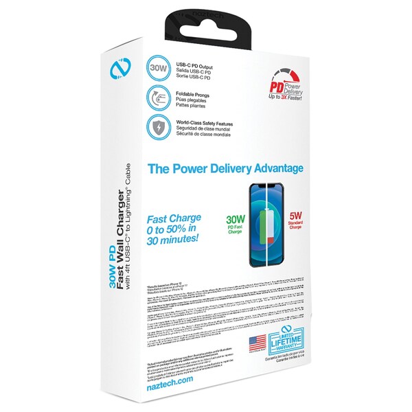 No more waiting. Experience the full speed of Power Delivery Technology with the Naztech 30 Watt Power Delivery USB-C to Lightning Wall Charger with 4 Ft. Cable. Never miss anything waiting on your phone to charge again.