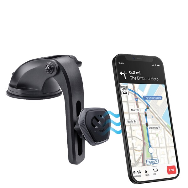 Experience the Naztech , revolutionizing hands-free mobile device use for driving. This highly versatile magnetic mounting system is designed for a clear unobstructed driving view while securing your mobile device at eye level and within easy reach. Enjoy a hassle-free, quick installation on your dashboard or windshield by positioning the sticky gel pad suction cup and pressing down on the 2-step locking lever. Find the perfect viewing height and angle using the 180° arm flexibility and sliding head adjustment. Then, hover your device near the powerful magnetic head, and 4 rare-earth magnets instantly grasp on, holding it in place. Keep navigation, hands-free calling, music control, and notifications at your fingertips or glanceable, even on the bumpiest roads. Unlike clunky mounts with clips and brackets that need constant 2-handed adjustment, this mount is engineered for quick 1-handed positioning and grab and go convenience.