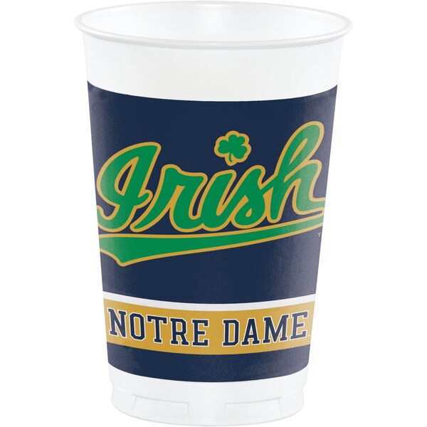 Drink plenty of fluids during the game in these Notre Dame 20 oz Plastic Cups. These cups hold 20 oz and feature a white center with the "ND" logo and then blue waves on the top and bottom filled with a repeating pattern of the Notre Dame mascot. Sold in packs of 96, the cups can be coordinated with any of our other Notre Dame party supplies.