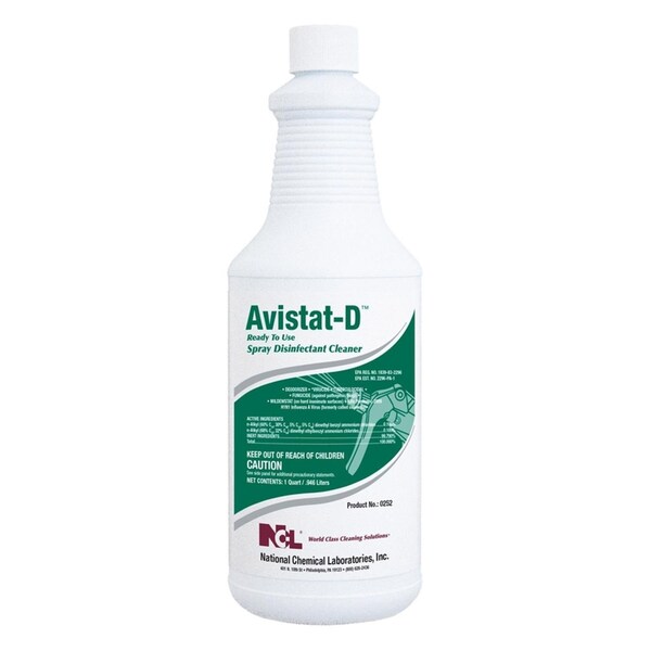 NCL Avistat-D RTU Spray Disinfectant Cleaner has now demonstrated effectiveness against SARS-CoV-2 which causes COVID-19 on hard non porous surfaces in just 1 minute. This product is a general ready-to-use cleaner and disinfectant for use in homes hospitals nursing homes shower rooms locker rooms public restrooms schools food service establishments restaurants transportation terminals office buildings manufacturing facilities lodging establishments retail businesses and athlete/recreational facilities where housekeeping is of prime importance in controlling the hazard of cross contamination. It is formulated to disinfect hard nonporous inanimate environmental surfaces such as floors walls metal surfaces stainless steel surfaces glazed porcelain glazed ceramic tile plastic surfaces chrome brass copper laminated surfaces bathrooms shower stalls bathtubs and cabinets. For plastic and painted surfaces spot test on an inconspicuous area before use.