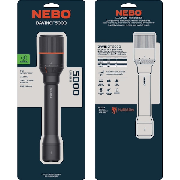 The DaVinci 5000-lumen rechargeable flashlight by Nebo is a powerful handheld flashlight with 4 light modes and an included power bank. The included mode selection dial makes it easy to switch between modes and the powerful LED in this flashlight can light up 192 meters. The included battery allows for up to 20 hours of operation in between charges. High: 5000 lumens 2-hour runtime 192-meter beam/Medium: 1000 lumens 5-hour runtime 90-meter beam/Low: 100 lumens 20-hour runtime 31-meter beam/Strobe: 5000 lumens 2-hour runtime 192-meter beam.