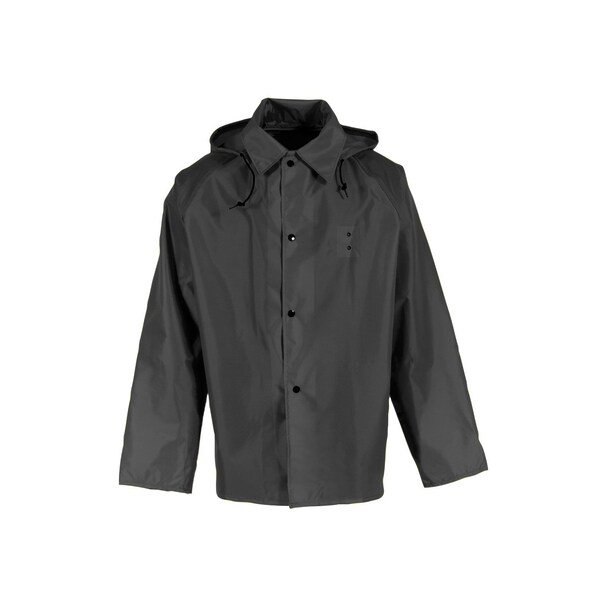 Polyurethane Coated Nylon; Attached Hood with Drawstring Closure; Raglan Shoulder Design; Slash-Thru Opening with Pockets on Each Side; Snap Front Closure with Interlocking Storm Flap; Badge Patch; Underarm Vents
