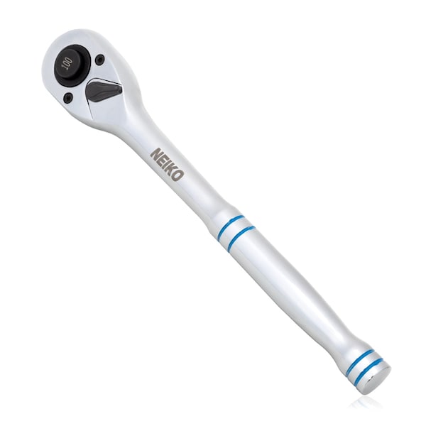 NEIKO 1/2'' Drive Reversible Ratchet Handle with Quick Release, Heavy duty ratchet handle by Neiko in 1/2 drive Total length for the handle is 10 inches, contoured grip for sure hold. Fully polished, precision machined and heat treated chrome vanadium steel is the perfect combination for hardness and torque ability for heavy duty work while being able to easily be wiped clean. Chrome Moly internal gearing material. Specialized tear drop, pear head design features 100 tooth mechanism for efficiency, strength and durability with only a 3.6 degree swing per revolution. Get the job done faster in tight spaces. Fast one finger touch flip switch serves the forward and reverse function to maneuver direction of socket turn to forward or reverse when tightening or loosening fasteners in tight spaces with the flip of your thumb. The ball detent feature locks your socket in so it won’t fall out when in use. One touch button at head of drive secures socket into place and quickly releases without hassle to loosen or tighten. Versatile drive body is 10''es long with an ergonomic contoured grip for comfort and pairs well for home maintenance and car or truck repair while reducing hand fatigue and slippage. Note: To remove the child safety cover on the ratchet drive, please press the release button directly behind the drive head all the way in, and simply pull off the child safety cover.