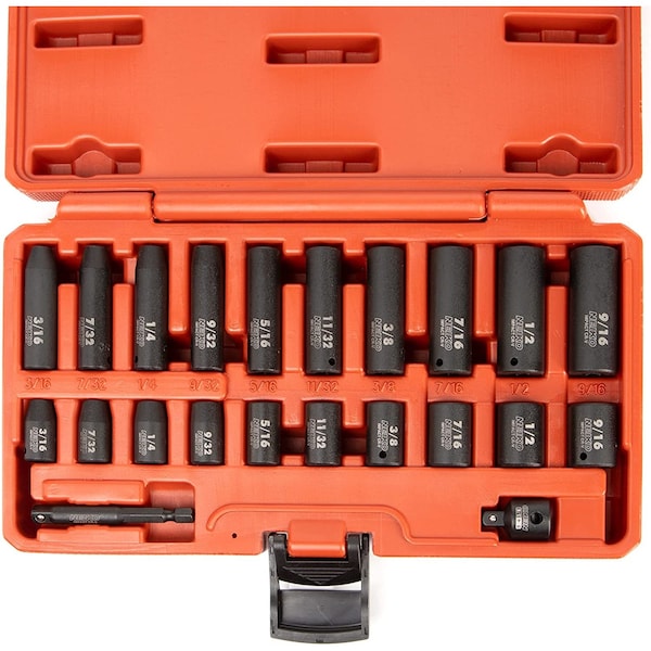 NEIKO presents 02435A our 1/4''-Drive Complete Impact Socket Set with standard sockets! This mechanic set includes both deep and standard SAE sockets with easy-to-read laser-etched markings for quick identification in your toolbox. Each automotive socket is protected from oil, dirt, and grease thanks to a phosphate coating and is constructed with drop-forged premium CrV steel for maximum life and durability. With a 6-point hex socket design to protect from round off and other damage, each socket in this socket extension set can be used with complete confidence. Socket-Adapter Set is perfect for use with power drills, ratchet handles, impact drivers, and other heavy-duty tools! These handy tool accessories are impact rated to meet your project requirements. Each extender is designed to work well with both hand tools and impact tools. Additionally, each set comes with a 3/8-to-1/4'' reducer. It also comes with a blow-mold socket case that has an individual space for each piece. Secure levers on the case prevent it from opening while you are traveling from jobsite to jobsite. Whether you need this high-quality socket set for use on a housing construction site or for an automotive mechanic job, it will help you get the job done quickly and efficiently for years to come. Includes: 1 x 3/8'' female to 1/4'' male reducer1 x Hex Drive Socket Adapter10 x SAE socket: 3/16'', 7/32'', 1/4'', 9/32'', 5/16'', 11/32'', 3/8'', 7/16'', 1/2'', 9/16''10 x Deep SAE socket: 3/16'', 7/32'', 1/4'', 9/32'', 5/16'', 11/32'', 3/8'', 7/16'', 1/2'', 9/16''Carrying Case