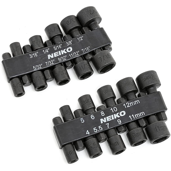 Whether you are a weekend warrior or a professional contractor, the NEIKO 10068A Power Nut Driver Bit Set is a must-have addition to your toolbox. Constructed from forged and hardened chrome vanadium steel, this set is heavy-duty, built to last. Featuring a full range of sizes, including: 10 pcs SAE: 5/32'', 3/16'', 7/32'', 1/4'', 9/32'', 5/16'', 11/32'', 3/8'', 7/16'', 1/2'' 10pcs metric: 4mm,5 mm, 5.5mm, 6mm, 7mm, 8mm, 9mm, 10mm, 11mm, 12mm. This set is ready for use with any impact driver, power drill or screwdriver. Compact storage keeps bits handy. Constructed from forged and hardened chrome vanadium steel, this set is heavy-duty, built to last.