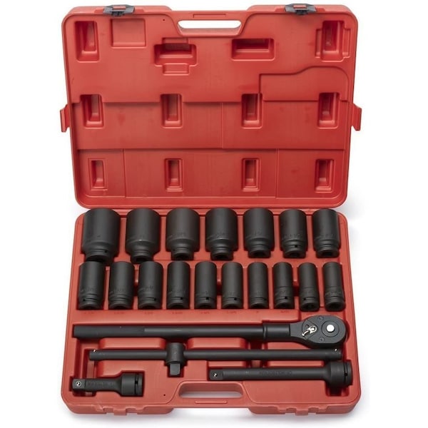 From trucks and tractors to heavy equipment and large machinery, big service and repair jobs need the 22-Piece 3/4'' Drive Impact Socket Set, with a range of sizes from 7/8 inch to 2 inch. Whether you drive them with an impact wrench or by hand, these premium chrome molybdenum sockets deliver superior performance. To prevent stripping or round-off under high stress, they feature a 6-point, high-torque design that contacts and grips the stronger flat sides of nut or bolt head, not the weaker corners. Extra large, high-contrast size markings are permanently laser etched onto each socket, making size selection quick and easy, even in low light. The 18 inch, 24-tooth quick-release ratchet, with non-slip knurled handle, locks onto sockets so they won't stick to fastener or fall off. To loosen frozen fasteners, grab the 18 inch breaker bar. Its sliding T head can be positioned at any point for maximum two-handed leverage. All parts are protected by a durable, corrosion-resistant black phosphate finish, and store in a heavy duty carry case. Set Includes: 16-piece 3/4'' drive impact sockets: 7/8, 15/16, 1 inch, 1-1/16, 1-1/8, 1-3/16, 1-1/4, 1-5/16, 1-3/8, 1-7/16, 1-1/2, 1-5/8, 1-3/4, 1-13/16, 1-7/8, 2 inch; 1-piece 13/16 inch square socket (for inner cap nuts); 2-piece 3/4'' drive extensions: 5 inches, 10 inches; 1-piece 3/4'' drive 18 inches quick-release ratchet handle (24 tooth); 1-piece 3/4'' drive 18 inches sliding T head breaker bar; 1-piece storage case.