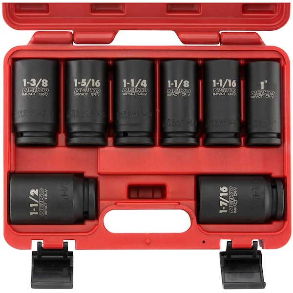 From trucks and tractors to heavy equipment or large machinery, big service and repair jobs need the NEIKO 02461A 3/4'' Drive Deep Impact Socket Set. Made for use with impact wrenches, these premium chrome vanadium sockets deliver superior performance with max torque output. Deep broach offers the length to reach over threaded shafts and into recesses. High-torque, 6-point design contacts and grips the stronger flat sides of the fastener head, not the weaker corners, to prevent stripping or round-off under extreme stress. Extra-large, high-contrast size markings are permanently laser etched onto each socket, making size selection quick and easy, even in low light settings. A durable black phosphate finish protects from rust and corrosion. Lastly, the rugged blow-mold case keeps everything organized for neat, efficient storage and makes for portability to carry to the job. This 8 piece set includes: 3/4'' drive impact sockets (SAE): 1, 1-1/16, 1-1/8, 1-1/4, 1-5/16, 1-3/8, 1-7/16, 1-1/2 inch.