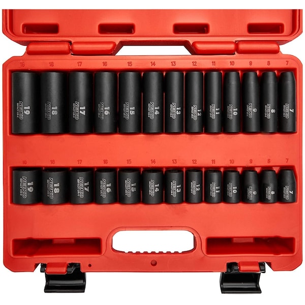 The NEIKO 02433A 3/8 inch Drive Standard and Deep Impact Socket Set comes stocked with 26 pcs consisting of Metric sizes, making it perfect for DIY projects in the home garage or for professional mechanics at an auto shop! Each piece is constructed with Premium Chrome Vanadium Steel to withstand extreme torque and stress during heavy use against fasteners, nuts, and bolts. And with its 6-Point Hex Design, it’ll prevent rounding off of corners while using with impact and electric wrenches. Product Features: - Laser-Etched markings for easy identification of sockets and measurements - Blow molded case with secured two lever locks to easily store, organize, protect, and carry - Black Phosphate Coating to protect against dirt, oil, and grease - 21 piece set consisting of: Metric Standard Sizes - 7mm, 8mm, 9mm, 10mm, 11mm, 12mm, 13mm, 14mm, 15mm, 16mm, 17mm, 18mm, 19mm Metric Deep Sizes - 7mm, 8mm, 9mm, 10mm, 11mm, 12mm, 13mm, 14mm, 15mm, 16mm, 17mm, 18mm, 19mm