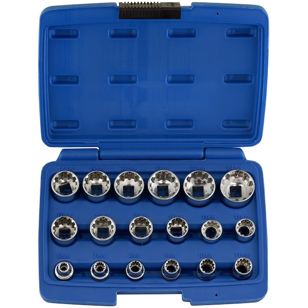 Our heavy-duty Metric 3/8'' Drive Universal Spline Socket is designed to tighten and un-tighten 4-point, 6 point, and 12 point fasteners making this the most useful socket on just about any fastener. * 8 in 1 6points & 12 points MM: 6,7,8,9,10,11,12,13,14,15,16,17,18,19,20,21,22,24 6 points &12 points SAE:9/32'',5/16'',11/32'',3/8'',7/16'',15/32'',1/2'',9/16'',19/32'',5/8'',21/23'',11/16'',3/4'',25/32'',13/16'',7/8'',15/16'' E-torque: E8, 10, 12, 14, 16, 18, 20, 22, 24, 26, 28, 30 Spline:6, 7, 8, 9, 10, 11, 12, 13, 14, 15, 16, 17, 18, 19, 20, 21, 22, 24mm Square:5,8,9,10,12,13,14,16,17,18,19