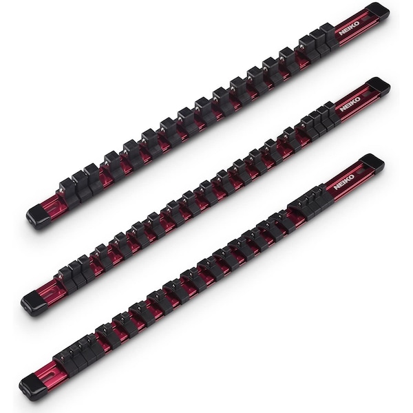 NEIKO proudly introduces our 02454A Aluminum Socket Holder and Organizer Set for all your socket-storage needs. Each rail holder measures 12.24'' x 3.15'' x 1.14'' and can organize 1/4'', 3/8'', and 1/2'' drives. The built-in spring-loaded ball detent on each socket clip creates a firm and secure hold. This convenient socket holder lets you quickly see and select the socket you need. With their aluminum construction, these organizer socket holders are lightweight for easy transport. Open hole slots on either end let you mount the holders on a pegboard or other tool board in your garage, at the job site, or in your workshop. You can also place these socket holders inside your toolbox. Removable rubber end pieces easily slide off the rails, and the interchangeable socket clips let you change between different sizes of sockets as needed. Each socket-holder set comes with 3 pieces for a total of 54 socket clips. The set includes the following clips: twenty 1/4'' drive, eighteen 3/8'' drive, and sixteen 1/2'' drive. Use this socket set for your automotive, mechanic, or personal projects to get the job done quickly and efficiently. Whether you need socket organizers for toolboxes or a way to keep your workspace tidy, NEIKO has your back with our durable, dependable, and strong tools.