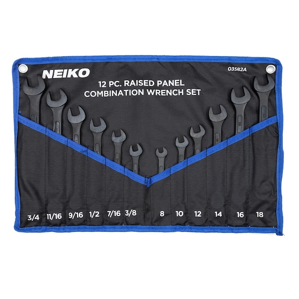 Introducing the NEIKO 03582A Combination Wrench Set, a 12-piece set of raised panel combo wrenches that includes both metric and standard sizes. Crafted from black oxide drop forged carbon steel, these wrenches are perfect for mechanics and other professionals looking for a reliable and durable tool set. This set also features an open-end wrench set in both SAE and MM sizes, as well as smaller box end wrench designs, so you know you'll have the right tool for any job. With this master wrench set at your disposal, you'll be prepared with just one roll up! SAE Sizes Included: 3/8'',7/16'',1/2'',9/16'',11/16'', & 3/4'' Metric Sizes Included: 8mm, 10mm, 12mm, 14mm, 16mm, & 18mm