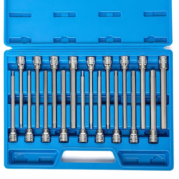 The NEIKO 10079A Extra Long Allen Hex Bit Socket Set of 18 Piece SAE and Metric commonly used allen head sizes for fitting on a ratchet. Each hex bit has your most common Allen head sizes to give you the versatility of finding the right fit for every job. Trust in NEIKO for your allen wrench socket needs! Extra long design allows bits to reach deep into hard to reach areas. Our durable S2 steel construction bit aids in reducing wear outs through multiple uses. Combined with a polished cr-v steel socket drive, our hex bit socket will provide maximum torque to tighten multiple types of fasteners. To give a little more detail about our precisely machined bits, they have chamfered ends (fancy word for a sloping edge). This is key to having it fit smoothly into fasteners and also protects not only the fasteners but your bits from wear and tear. Our socket set comes enclosed in a blow molded case to keep all your sockets organized. The sizes are embossed on the case as well as engraved on our sockets, so you never have to figure out what size you have. Included Sizes: SAE: 3/8'' drive sizes 1/8'', 5/32'', 3/16'', 7/32'', 1/4'' 9/32'', 5/16'', & 3/8'' METRIC: 3/8'' drive sizes 3mm, 4mm, 4.5mm, 5mm, 5.5mm, 6mm, 7mm, 8mm, 9mm, & 10 millimeter