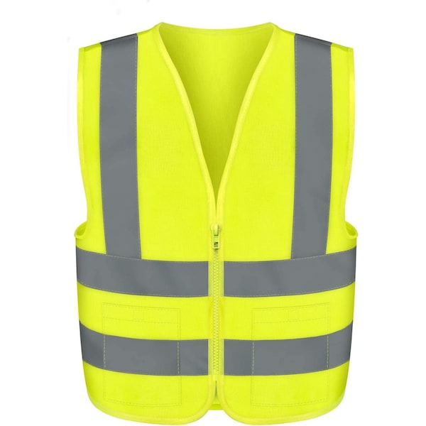 High Visibility Neon Yellow Zipper Front Safety Vest. Comfortable safety vest made with breathable wrap knitted fabric.