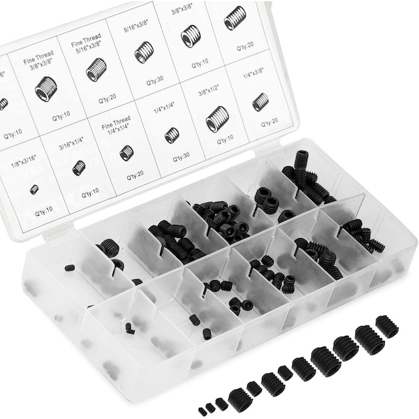 NEIKO introduces our 50484A Internal Hex Allen Set Screw Assortment Kit is perfect for garage, workshop, or home use. With 200 included pieces, it is sure to have the screw size you need for your projects. Each piece in the screw assortment kit is constructed with hardened alloy steel to be durable and long-lasting. Thanks to the standard SAE sizes, you can use the fasteners in this set as replacement screws. The included heat-treated clips act as ideal holders for any construction material. Use this strong hardware assortment as you build a deck, frame wood, attach plywood, or perform other building tasks. Store all your hex screws in the included plastic case and use the organization chart on the inside of the case lid to quickly identify which size screw you need. These Allen-head sockets are available in a variety of sizes to replace or repair damaged screws. Our hex Allen screw box set includes 3 fine thread sizes and 9 coarse thread sizes. It comes with the following standard coarse-thread sizes: 5/32'' x 3/16'', 5/16'' x 3/8'', 3/8'' x 3/8'', 5/16'' x 1/2'', 1/8'' x 3/16'', 3/16'' x 1/4'', 1/4'' x 1/4'', 3/8'' x 1/2'', and 1/4'' x 3/8''. It also comes with the following fine-thread sizes: 3/8'' x 3/8'', 5/16'' x 3/8'', and 1/4'' x 1/4''. Whether you need a hex Allen screw assortment or sturdy fasteners for the jobsite, NEIKO has your back with our durable, dependable, and strong tools.