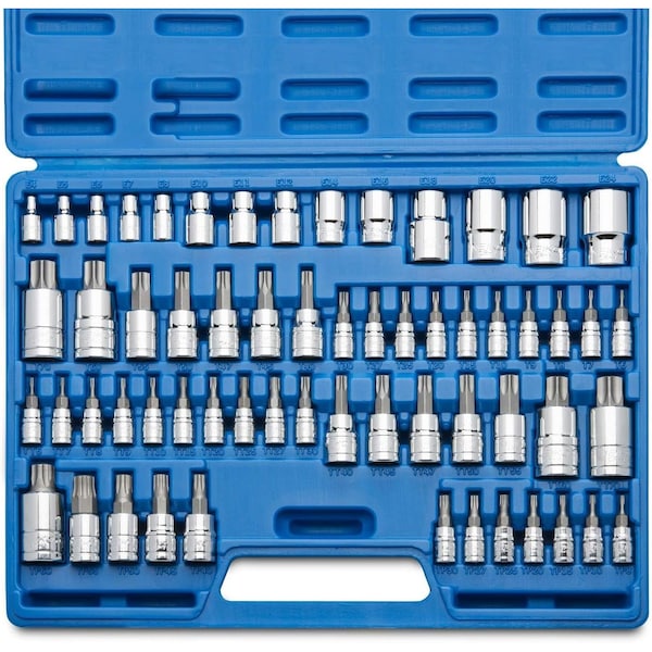 NEIKO presents the all-in-one Master Torx Bit Socket and External Torx Socket Set for all your Torx needs! Made with premium S2 steel, these bits provide optimal strength and durability to unfasten or tighten screws and other bolts. The chamfered end bit prevents the bit and fastener from damage and stripping. With so many sizes available, these bit ends let you find a precise fit. The sockets are created with durable chrome vanadium for extra power and feature a mirrored chrome finish for a polished and professional look. This Torx wrench set also comes with a high-impact storage and carrying case. Use this all-in-one master socket set for all of your home or work projects that need power. The 14-piece Torx e-socket set comes with a 5-piece 1/4'' drive and bits in E4, E5, E6, E7, and E8 sizes; a 5-piece 3/8'' drive with bits in E10, E11, E12, E14, and E16 sizes; and a 4-piece 1/2'' drive with bits in E18, E20, E22, and E24 sizes. The 17-piece Torx bit socket set comes with a 10-piece 1/4'' drive and bits in T6, T7, T8, T9, T10, T15, T20, T25, T27, and T30 sizes; a 5-piece 3/8'' drive with bits in T40, T45, T47, T50, and T55 sizes; and a 2-piece 1/2'' drive with bits in T60 and T70 star sizes. The 17-piece Torx tamper bit socket set comes with a 10-piece 1/4'' drive and bits in T6H, T7H, T8H, T9H, T10H, T15H, T20H, T25H, T27H, and T30H sizes; a 5-piece 3/8'' drive with bits in T40H, T45H, T47H, T50H, and T55H sizes; and a 2-piece 1/2'' drive with bits in T60H and T70H sizes. The 12-piece Torx-plus bit socket set comes with a 7-piece 1/4'' drive with bits in T8, T10, T15, T20, T25, T27, and T30 sizes; a 4-piece 3/8'' drive with bits in T40, T45, T47, T50, and T55 sizes; and a 1-piece 1/2'' drive with a T60 size bit. Whether you’re a mechanic or a construction worker, this 60-piece torque bit set will help you get the job done quickly and efficiently.