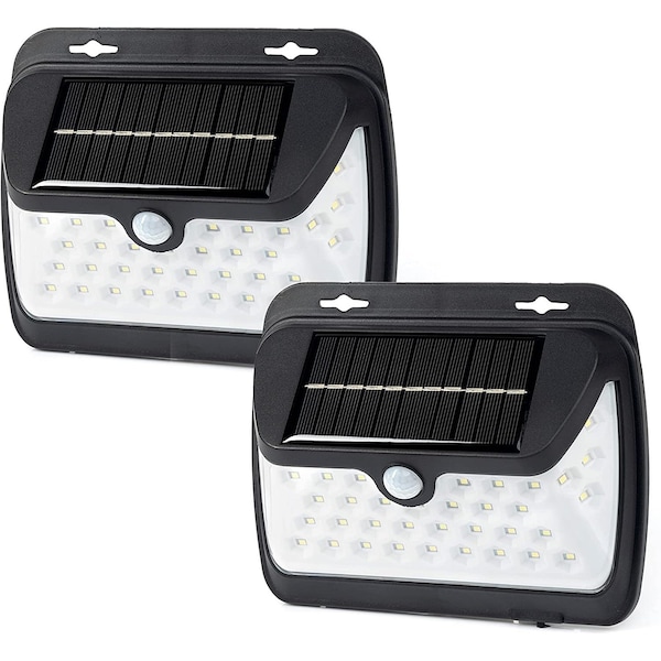 NEIKO 40498A Outside Solar Light with Motion Sensor, 2 Pack, Outdoor Light with Super Bright Wide Angle Solar Light LED, Waterproof Flood Light, Solar Security Lights, Sensor Light. LED LIGHTS: Two motion flood light with 38 bright LEDs each, a brightness of 150 lumens, 15w, and a run time of 12 hours on a one-day charge. Two Bright solar powered sensor lights for outside with no wires needed, ready to go out the box just set it and forget it. SOLAR PANEL: Two solar spotlights is rechargeable with direct sunlight and fully charges in 8 hours. Cordless light activates for 20 seconds and then automatically turns off if there is no movement for energy savings. MOTION DETECTOR: PIR motion detection with 120-degree wide angle motion detection and motion activated from up to 16 feet away. Two Solar security lights pack to deter any unwanted strangers or wildlife away. Home motion lights to brighten your yard at night. OUTDOOR LIGHTING: Constructed of durable ABS+PC heat proof plastic with a IP64 weather and water-resistant rating. Can even work as an outdoor security camping night light for those dark areas or as backyard lights. HOME DECOR: Two outside motion lights for house light up your porch, deck, driveway, gutters, garbage area, or any outdoor pathway with this patio decor light. Easy install to your fence or most walls with the provided mounting screw hardware.