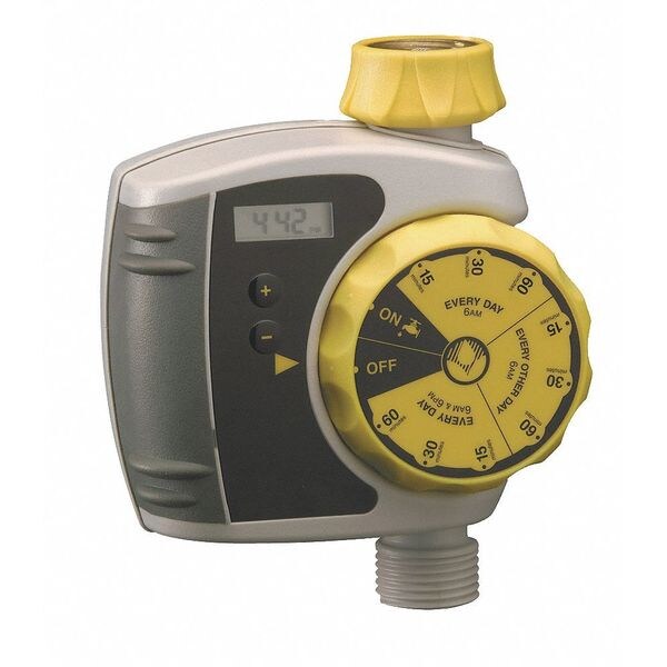 Preset Watering Timer, Display Type Digital LCD, Enclosure Type Outdoor, Power Source (2) AA Batteries, Depth 4-5/8 In., Features Display Shows Time In AM/PM or 24 hr. Display Except While In Manual Mode, Display Shows Countdown In Manual Mode, Width 2-3/8 In., Coupling 3/4 In. GHT, Manual Override On/Off, Height 5-9/16 In.