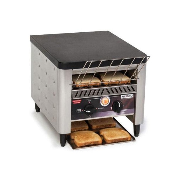 Conveyor toaster; 18 in (H) x 14 in (W) x 15 in (D); 2 slice conveyor; 300 pieces an hour; Stainless steel body with louvers stays cool to the touch; Removable crumb tray; Controls for toasting on both sides, one side, and standby mode; 120V/60Hz/13.8A/1660W/1-Ph; cETLus listed; NSF Certified