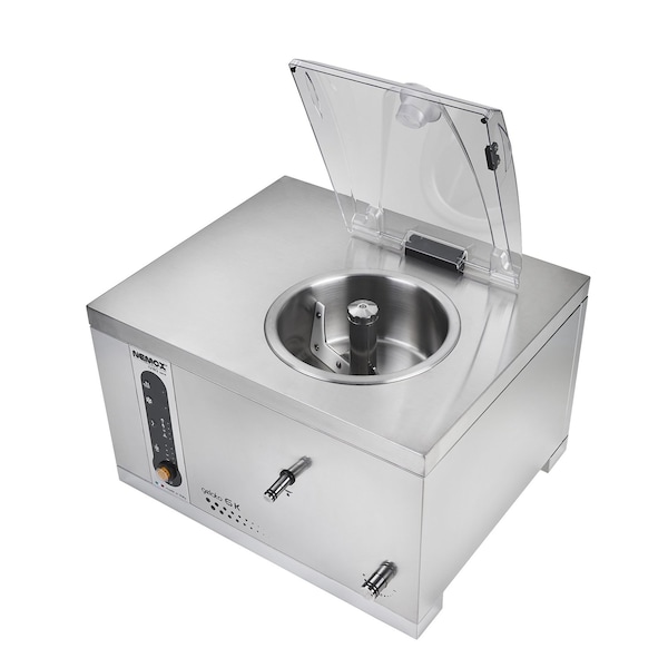 The CREA 6K is a professional-grade countertop gelato, ice cream and sorbet machine - an excellent solution for cafes, restaurants, bakeries, gelato shops or small- to medium-volume kitchens that want to produce quality frozen desserts with consistency and flexibility. Compact but powerful, the unit is built with stainless steel construction, delivering durability, easy sanitation and longevity even under frequent use. With the CREA 6K you get four preset production modes: Classic Gelato, Semi-Soft Ice Cream, Granita and Shock-Freezing. These automatic programs - plus four corresponding storage settings - give you flexibility to produce a variety of frozen desserts and then maintain them at serving temperature or texture until you are ready to serve. If preferred, you can also operate the machine manually for total control over mix timing and texture. To help shape density and consistency, the machine uses a stainless-steel blade with removable scrapers, and incorporates an electronic inverter system that allows you to control and regulate blade and motor speed. Each batch handles up to about 1.75 kg of base, producing roughly 2.5 L (Approx. 2.65 qt) of finished gelato/ice cream in a typical 12-15 minute cycle. When running continuously, the CREA 6K can produce approximately 10 L (Approx. 10.6 qt / Approx. 7 kg) per hour - making it well-suited for small- to mid-scale production without requiring bulky floor-mounted equipment. The bowl capacity is 5 L, and the machine's operating speed varies between about 80 and 120 RPM - giving you the ability to influence texture and overrun depending on your recipe and desired density. The machine runs on standard 120 V power (800 W, 9 A) with a common plug (NEMA 5-15P), so it can be installed in most commercial kitchens without special electrical work. In short: the CREA 6K combines compact, countertop-friendly dimensions with serious professional-grade performance. Its mix of automatic and manual modes, output capacity, and flexible texture control make it an excellent choice for gelato, ice cream or sorbet production when you want quality, consistency and versatility without sacrificing space or ease of use.