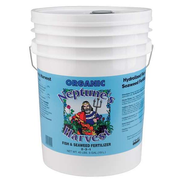 Natural Fertilizer, 5 gal, For Use On Flower Gardens, Lawns, Shrubs, Trees, Turf, Vegetable, For Use With 1 oz Per gal of Water, Chemical Composition North Atlantic Fish, Seaweed, Color Brown, Features Non Burning, Non Polluting