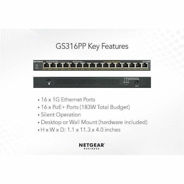 Business GS316PP Ethernet Switch, Power Adapter, Wall Mount Kit, Rubber Footpads for Desktop Installation, Installation Guide