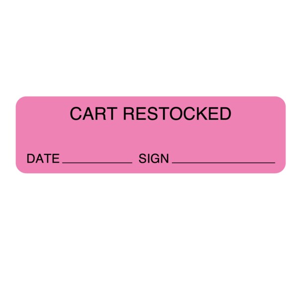 Label, "Cart Restocked" 7/8" x 3" Flr Pink w/Black