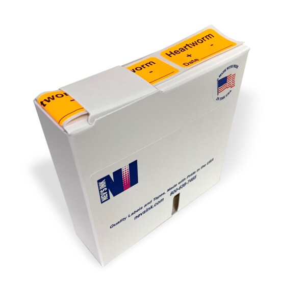 Heartworm labels. Custom printing and colors available. Feature a permanent pressure sensitive adhesive. 560 labels per roll.