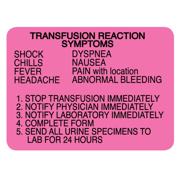 Label, Transfusion Reaction Symptoms 1-3/4" x 2-1/2" Flr Pink w/Black
