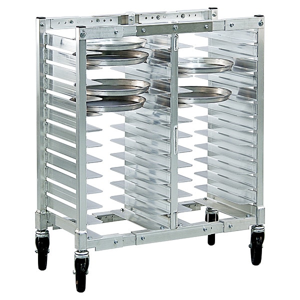 Adjustable Pizza Pan Rack, Nesting No, Overall Height 34 3/4 in, Brake No, Product Type Adjustable Pizza Pan Rack, Caster Type (4) Swivel Stem, Depth 13 3/8 in, Distance Between Shelves 2 in, Number of Slots 26, Includes Top No, Compatible Pan/Tray Dimensions 10 to 16 in, NSF Certified No