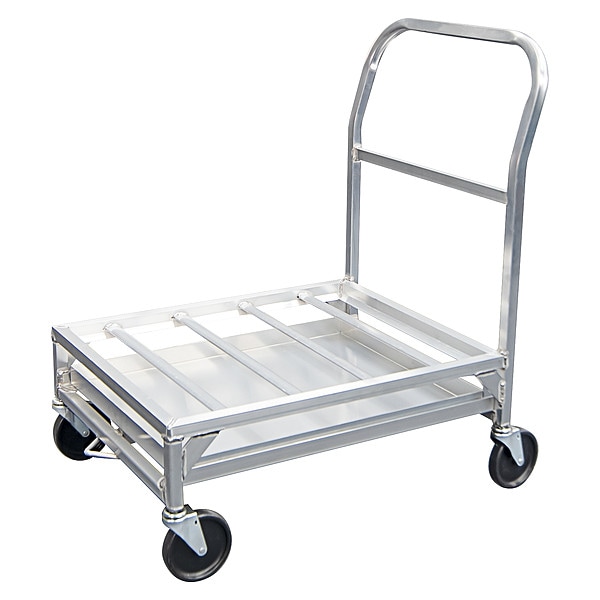 Food Box Dolly, Caster Type (4) Swivel, Maximum Load Capacity 500 lb, Material Aluminum, Number of Casters 4, Product Type Food Box Dolly, Overall Height 36 in, Overall Length 33 in, Overall Width 24 in, NSF Certified Yes