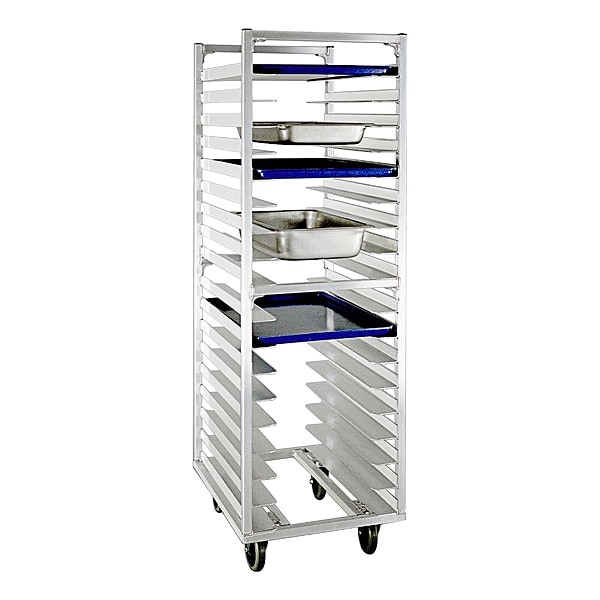 Heavy Duty Refrigerator/Proofer Rack, Nesting No, Overall Height 64 in, Brake Yes, Overall Width 20 3/8 in, Product Type Refrigerator/Proofer Rack, Caster Type (4) Swivel, Depth 26 in, Distance Between Shelves 3 in, Number of Slots 18, Includes Top No, Material Aluminum, Compatible Sheet Pan Size Full Size, Compatible Pan/Tray Dimensions 13 x 18 in, 14 x 18 in, 18 x 26 in, NSF Certified Yes, Size Full Size