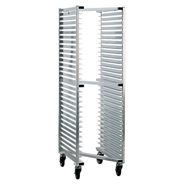 Pan Rack, Nesting Yes, Load Capacity 700 lb, Overall Height 69 3/4 in, Brake No, Overall Width 20 3/8 in, Product Type Pan Rack, Caster Maximum Temperature Rating 180 Degrees F, Caster Type (4) Swivel Plate, Color Silver, Depth 26 in, Distance Between Shelves 2 in, Number of Slots 30, Includes Top No, Material Aluminum, Compatible Sheet Pan Size Full Size, Half Size, Compatible Pan/Tray Dimensions 13 x 18 in, 14 x 18 in, 18 x 26 in, NSF Certified Yes, Size Full Size