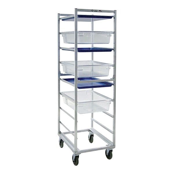 Poly Box/Sheet Pan Combination Rack, Nesting No, Overall Height 69 3/4 in, Brake Yes, Overall Width 20 3/8 in, Product Type Pan Combination Rack, Caster Type (4) Swivel, Depth 26 in, Distance Between Shelves 7 1/2 in, Number of Slots 9, Includes Top No, Material Aluminum, Compatible Pan/Tray Dimensions 18 x 26 in, NSF Certified Yes