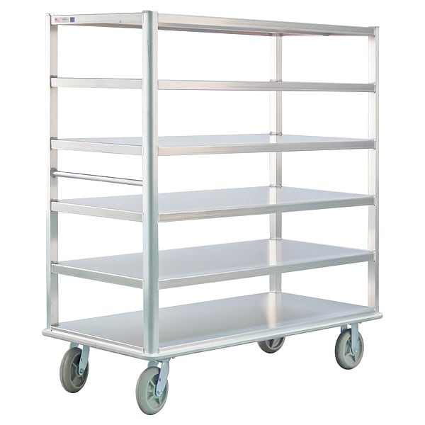 Queen Marys for Bussing, Caster Type (2) Rigid, (2) Swivel, Caster Diameter 8 in, Material Aluminum, Overall Width 29 in, NSF Certified Yes, Number of Casters 4, Overall Length 62 in, Color Silver, Maximum Load Capacity 3,000 lb, Number of Shelves 6, Includes Handle Yes, Distance Between Shelves 9 1/4 in, Overall Height 66 in, Shelf Edge Style All Edges Down, Product Type Queen Mary Banquet Cart