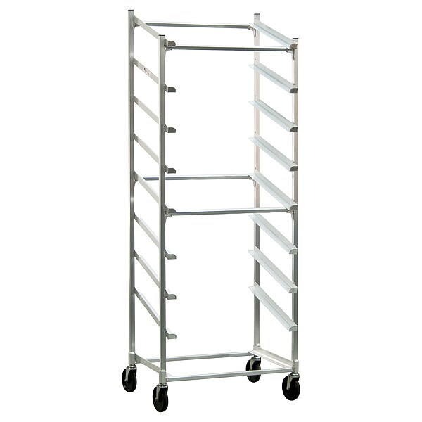 Slant Display Rack, Caster Type Swivel, Overall Height 77 1/4 in, Overall Width 28 1/2 in, Overall Depth 22 in, For Use With 18 x 26 in Pans, Finish Smooth, Product Type Slant Display Rack, Capacity per Shelf 50 lb, Color Soft Gray, Load Capacity 450 lb, Mobile/Stationary Mobile, Number of Shelves 9, NSF Certified Yes, Distance Between Shelves 7 1/2 in, Frame Material Aluminum, Shelf Depth 18 in, Shelf Material Aluminum, Shelf Width 26 in