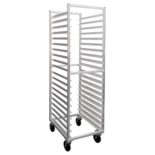 Sheet Pan Rack, Nesting No, Overall Height 69 3/4 in, Brake No, Overall Width 20 1/2 in, Product Type Pan Rack, Caster Type (4) Swivel, Depth 26 in, Distance Between Shelves 3 in, Number of Slots 20, Includes Top No, Compatible Sheet Pan Size Full Size, Half Size, Compatible Pan/Tray Dimensions 13 x 18 in, 14 x 18 in, 18 x 26 in, NSF Certified Yes, Size Full Size