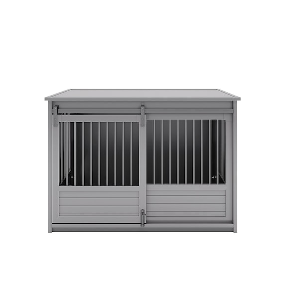 The New Age Pet Barndoor Crate is crafted with ECOFLEX-a unique blend of recycled polymers and reclaimed wood fiber by-products. This non-toxic, eco-friendly material is impervious to moisture and odor, making it the perfect choice for pet furniture. The crate features enhanced durability and security with upgraded hardware, ensuring your pets safety and the crates longevity. Its elegant design seamlessly complements any home decor, adding rustic charm to your space. Spacious and comfortable, the crate is designed to accommodate medium to large dogs and is available in sizes large and extra-large. Versatile in use, it doubles as an end table, blending functionality with style. Easy to assemble and maintain, the crate offers convenience for pet owners. Choose between antique white and gray to match your homes aesthetic.
