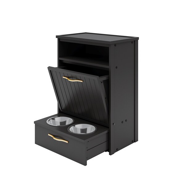 Elevate your dogs mealtime with the sleek and multifunctional Brea Pantry Diner from New Age Pet, perfect for all-size dogs. This modern feeding station features an angled-door compartment that holds approximately 25 pounds of dog food, keeping meals easily accessible. When its time to feed, simply pull out the hidden drawer to reveal two easy-to-clean stainless steel bowls, and tuck them away after use to maintain a clutter-free space. Combining style and practicality, the Brea Pantry Diner offers an all-in-one solution for a clean, organized dining area.