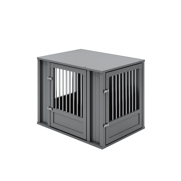 The New Age Pet FlexiDoor Dog Crate, made from ECOFLEX for durability and moisture resistance, features 2 doors-one on the front and one on the short-side that can be placed on either the right or left end of the crate. Available in 2 colors and 3 sizes, its perfect for pet parents looking for eco-friendly design and versatility.
