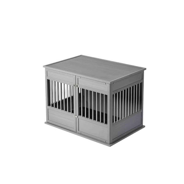 The New Age Pet Horizon Pet Crate, crafted with durable ECOFLEX, offers a stylish and functional solution for pet containment. As a variation of the popular InnPlace Crate, the Horizon Pet Crate features stainless steel spindles and charming bone-shaped latches. Designed with convenience in mind, the door is positioned on the long side of the crate, providing easy access. Available in three sizes and two colors, this crate complements most home decors while accommodating a wide range of dog breeds.