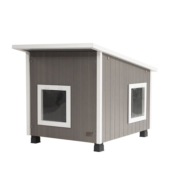 Introducing the all new Outdoor Cat House XL, by New Age Pet. With a whopping 30% increase in size, this new, larger, outdoor cat house provides ample space for outdoor cats of all sizes to relax, play, and feel at home. The Outdoor Cat House XL is made with ECOFLEX, a proprietary blend of new and recycled polymers and reclaimed wood fiber by products. ECOFLEX is a durable, non toxic, moisture resistant, and eco friendly material. Designed with your cat's health & safety in mind, this outdoor cat house features a raised floor design to keep them elevated from the ground, protecting them from cold and damp conditions and two entry/exit points so your cats can come and go as they please, giving them a sense of freedom and security. For added protection against the elements, we've included two vinyl door flaps that can be easily attached to keep out wind, rain, and cold drafts. Maintaining the Outdoor Cat House XL is a breeze, simply wipe it down or rinse it off with a garden hose, and it will be as good as new. At New Age Pet, we stand by the quality and durability of our products. That's why the Outdoor Cat House XL is backed by an unrivaled 10 year limited manufacturer's warranty. Upgrade your outdoor cat's living space and give them the comfort, safety, and room to roam that they deserve. Invest in their happiness and well being with a product that is built to last.