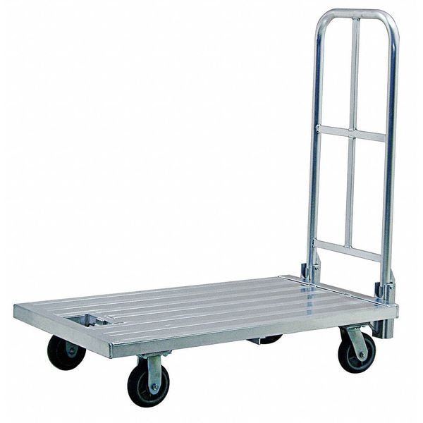 Platform Truck, Load Capacity 800 lb, Overall Height 51 9/16 in, Deck Material Aluminum, Deck Height 9 1/8 in, Deck Length 48 in, Deck Width 26 1/4 in, Frame Material Aluminum, Handle Type Removable Cross-bar