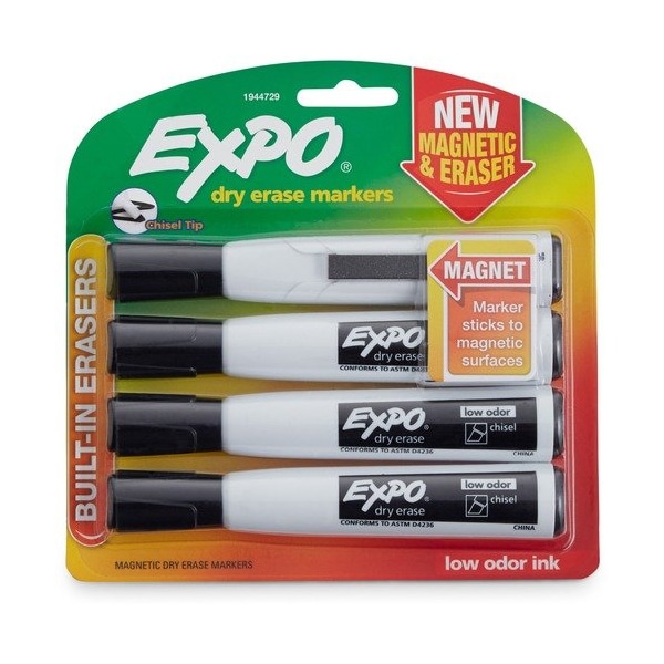 Newell Brands Dry-Erase Markers, Low Odor, Chisel Tip, 4/PK, BK, MARKER,DRYERS,MAGN,CHSL,4PK