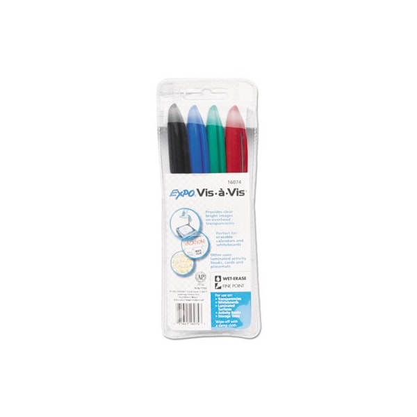 Handy pen is designed specifically for marking on acetate films, such as overhead projector transparencies and laminated boards. Formulated for intense heat, the fade-proof ink dries quickly, without bubbles or cracks. Durable fine-point tip aids in the production of highly detailed graphics and legible text. Bold, bright colors help your ideas stand out. Marks wipe away easily with a damp cloth. Odorless Vis--Vis products are an ideal choice for use in classrooms and small offices. Marker Ink Type: Wet Erase; Marker Tip Type: Bullet; Marker Tip Size text: Fine; Marker Colors: Assorted.
