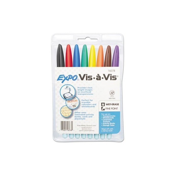 Handy pen is designed specifically for marking on acetate films, such as overhead projector transparencies and laminated boards. Formulated for intense heat, the fade-proof ink dries quickly, without bubbles or cracks. Durable fine-point tip aids in the production of highly detailed graphics and legible text. Bold, bright colors help your ideas stand out. Marks wipe away easily with a damp cloth. Odorless Vis--Vis products are an ideal choice for use in classrooms and small offices. Marker Ink Type: Wet Erase; Marker Tip Type: Bullet; Marker Tip Size text: Fine; Marker Colors: Assorted.