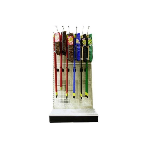 Steel Merchandising Rack & Hook Set For A 4 Assortment Of Pushbrooms Has 8 Hooks & 8 Handle Guides Hooks Attach To Two 2 Frames Which Are Part Of The Kit Allows Pushbrooms To Be Merchandised With The Head Of The Broom At The Top Of The Planogram.