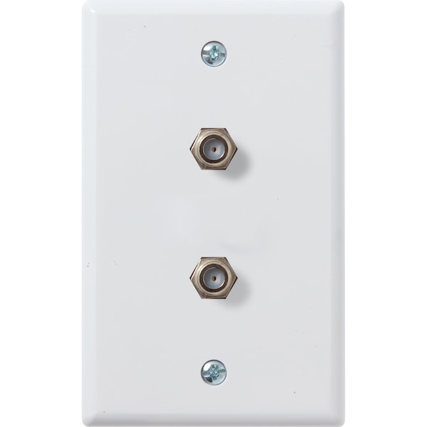 1-pack of dual coaxial wall plates with mounting hardware included. Each wall plate measures about 4.5 x 2.75 in. The plates are made from ABS plastic, which are corrosion resistant, hard to break and can withstand high temperatures. Standard F-type connector attached to a coaxial cable is used to connect devices such a modem, router, or CATV box for video and internet services to the wall jack plate.